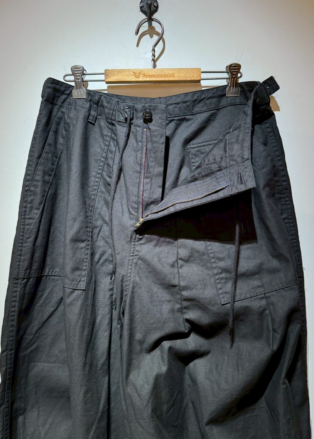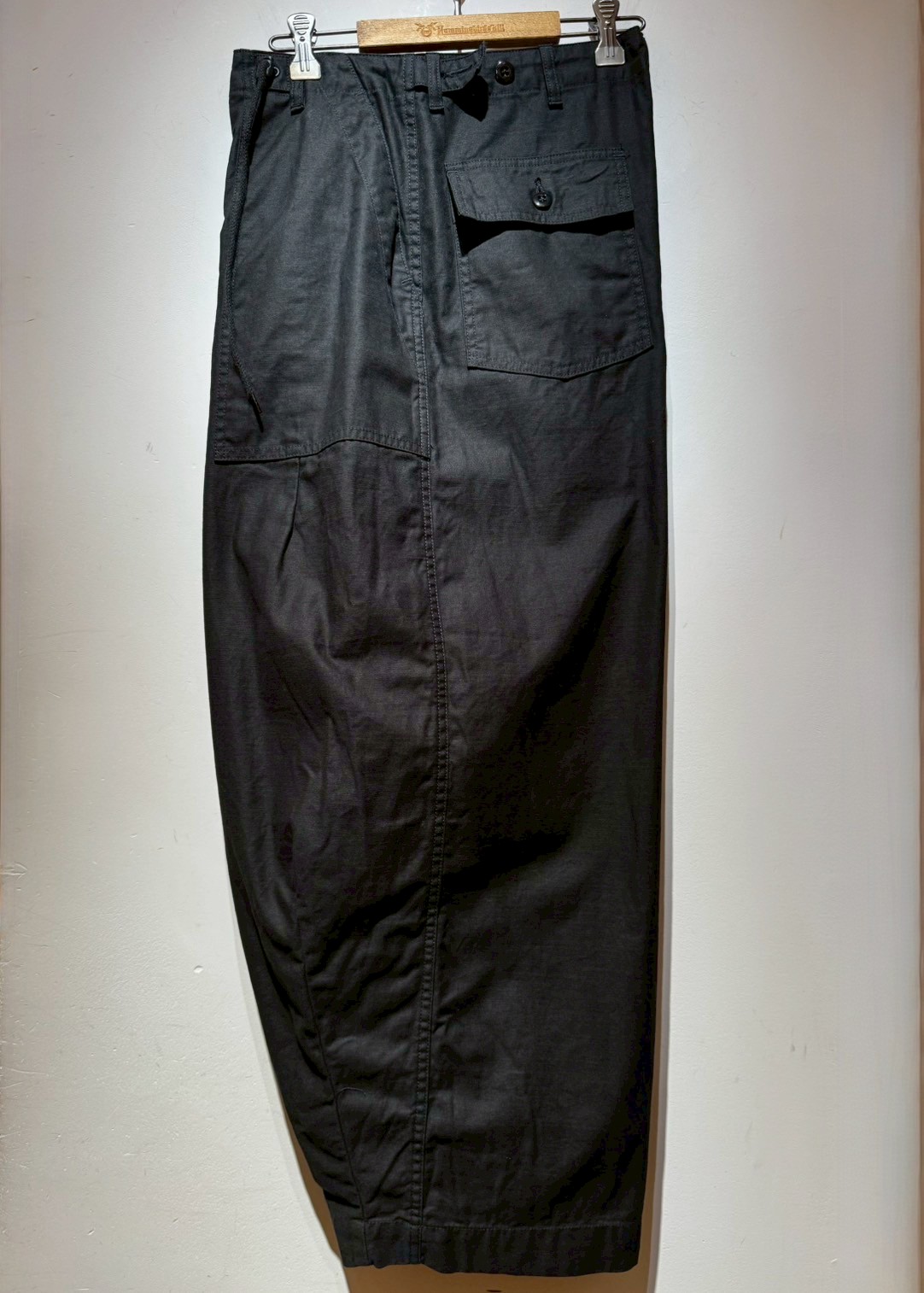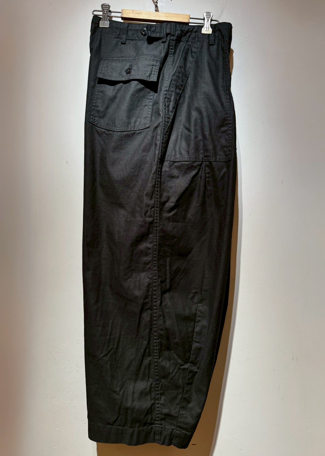 ウエストと裾のダーツ処理によりフロントが大きくふくらんだ独特のシルエットが魅力の人気アイテムH.D. パンツが再入荷。リラックス感のあるシルエットで、開放感のある履き心地も魅力的で す。フロントのL字型のポケットやサイドアジャスターなど、ファティーグパンツのデザインを落とし込んだデザイン。ハリ感のあるコットン・バックサテン素材を使用しています。
