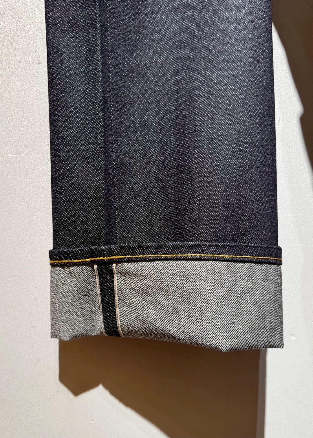 整理加工で毛焼き処理のみを行っているため毛羽が無く、濃紺のピュアインディゴで染色された生地を使用しています。