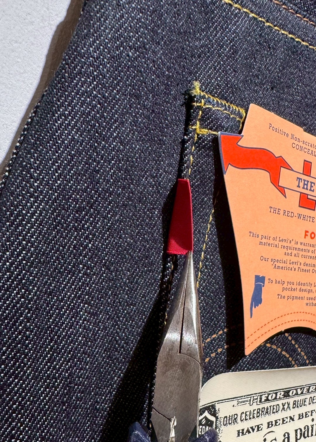 第二次大戦時代のジーンズを再現することで、資材節約の時代を反映させています。オリジナルでは、ウォッチポケットリベット、クロッチリベット、バックウエストシンチが省略されていました。無駄を省いたスタイルが特徴のオリジナルに忠実に。刻印のない標準仕様のボタンに月桂樹の葉をデザインしています。