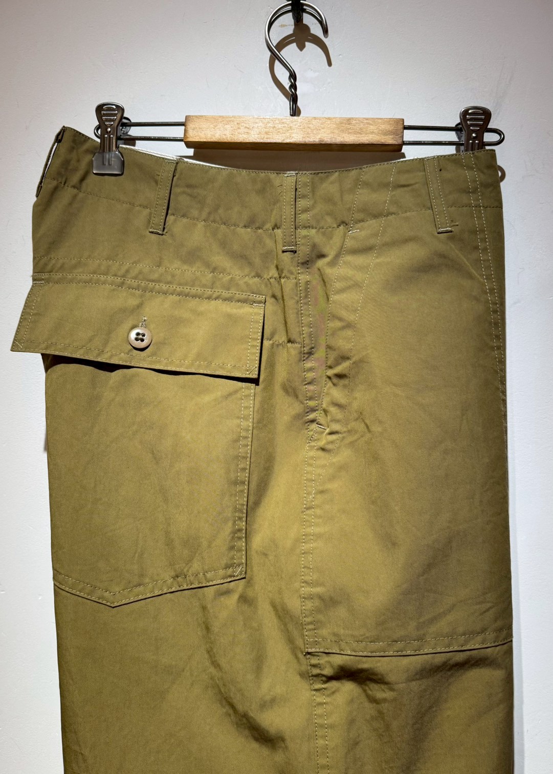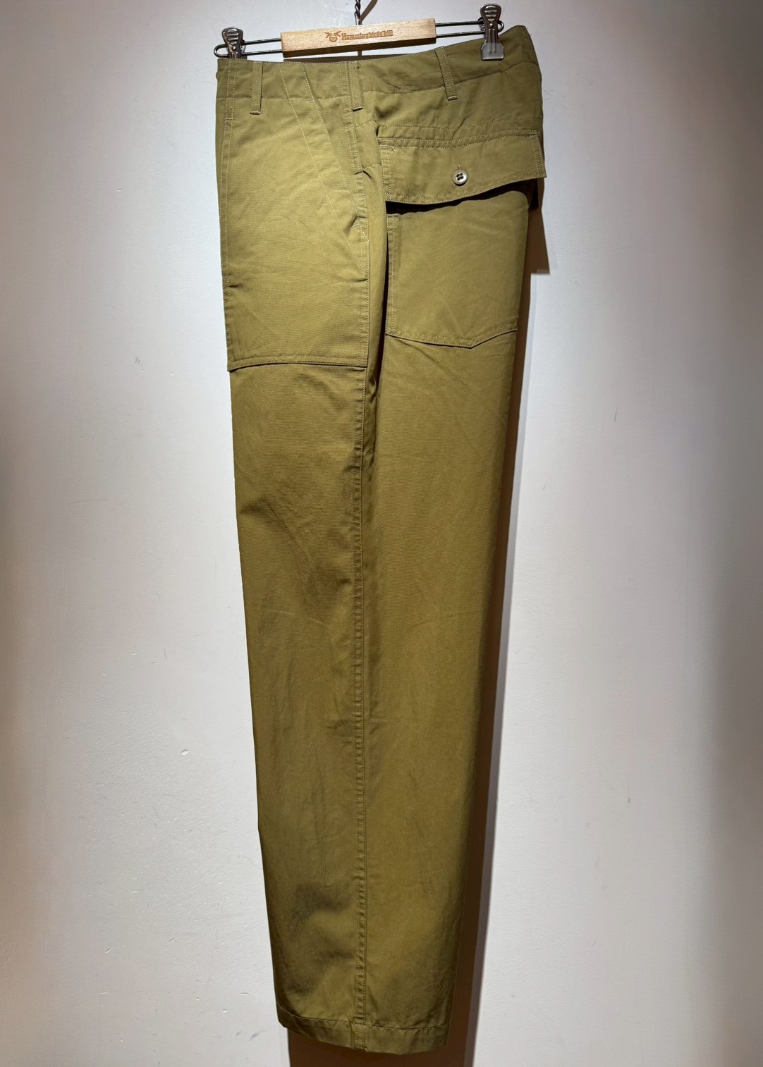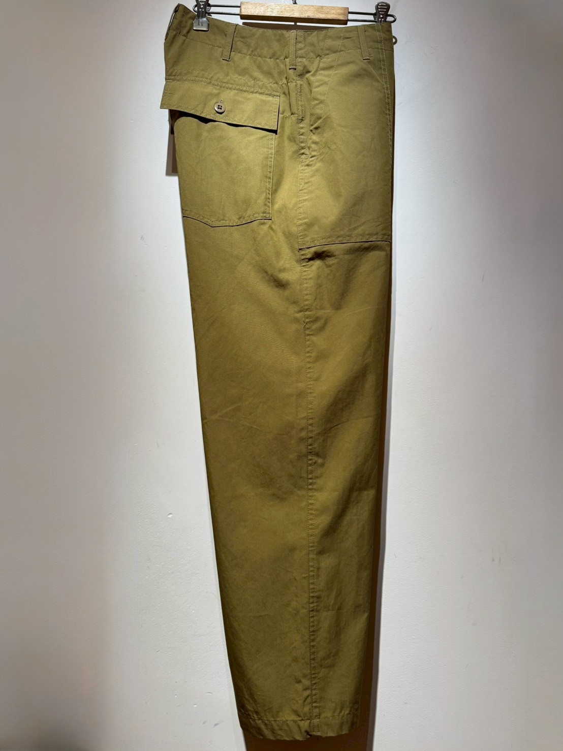 USアーミーのミリタリーパンツをベースに、独自のアレンジを加えた定番のファティーグパンツ。ナチュラルにテーパードがかかった、幅広いスタイルにマッチする万能型のシルエットが魅力です。特徴的なフロントのL字ポケット脇には、さらにジップポケットが追加されており、シンプルな中にも〈EG〉らしいユニークなギミックが備わっています。
