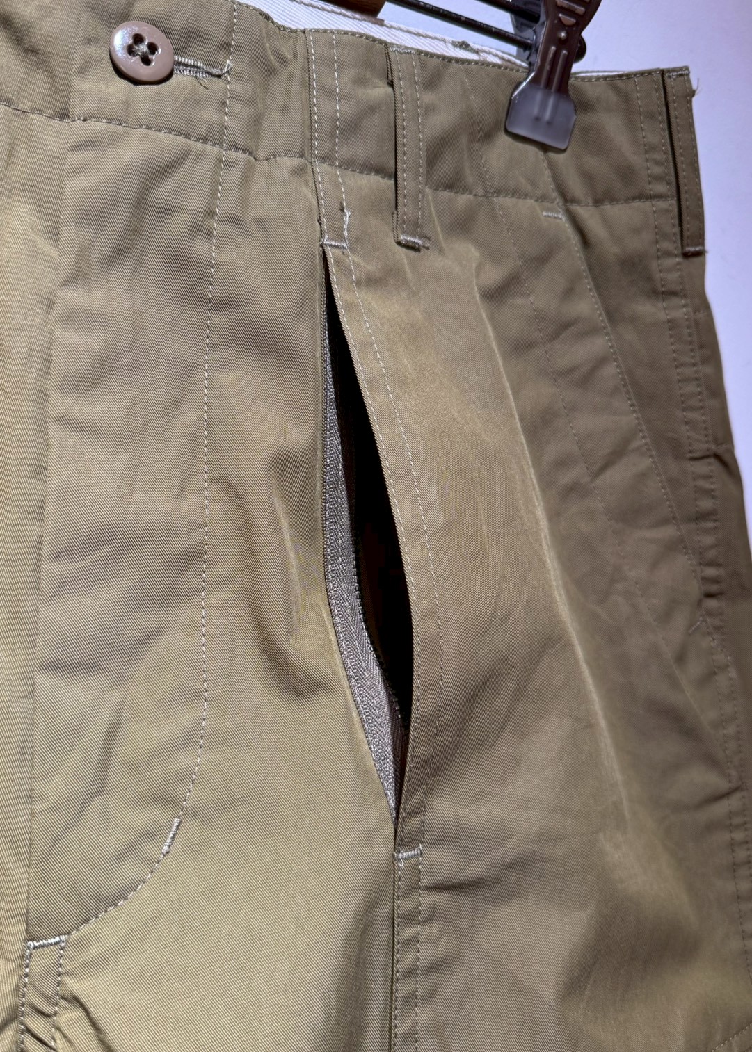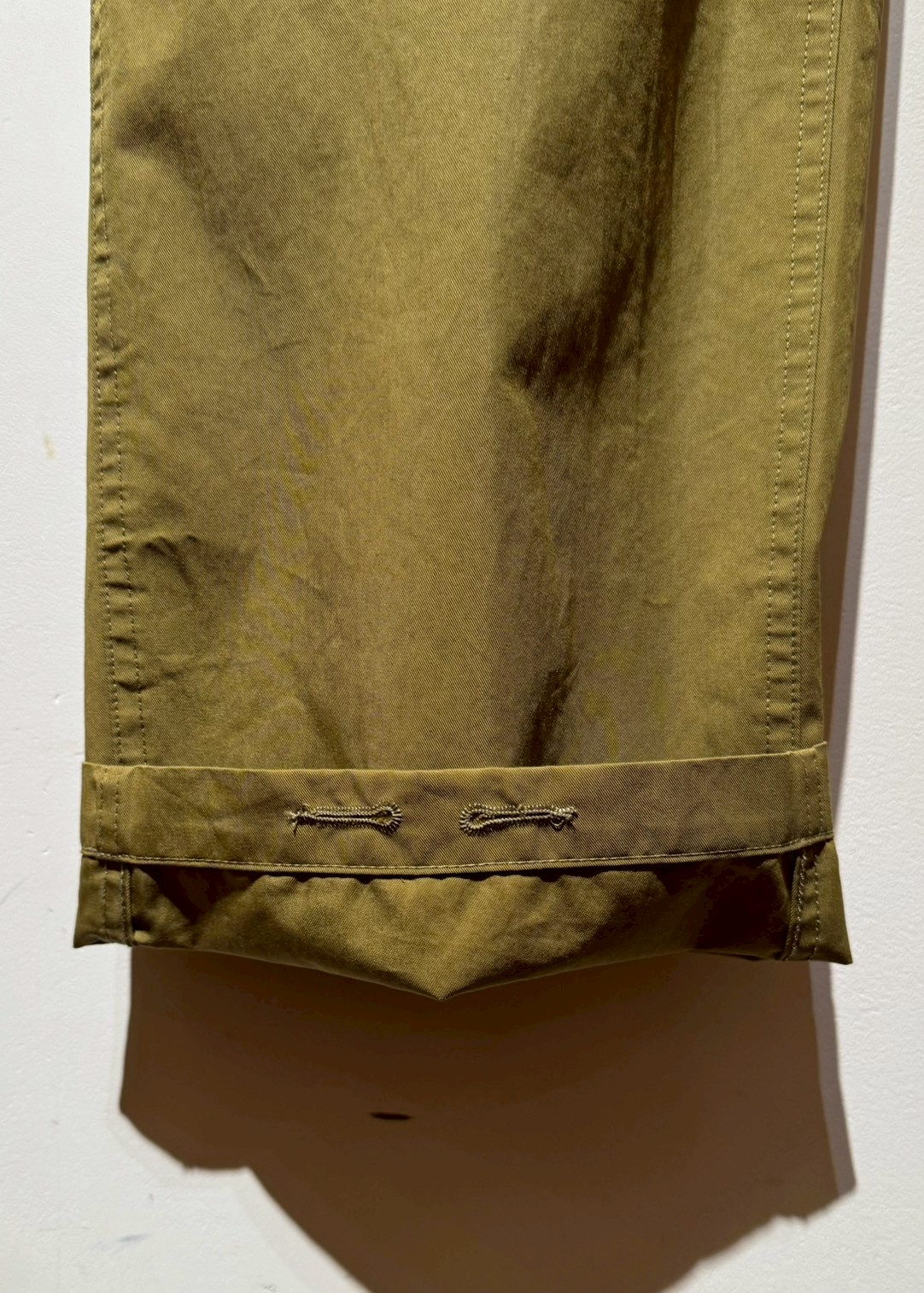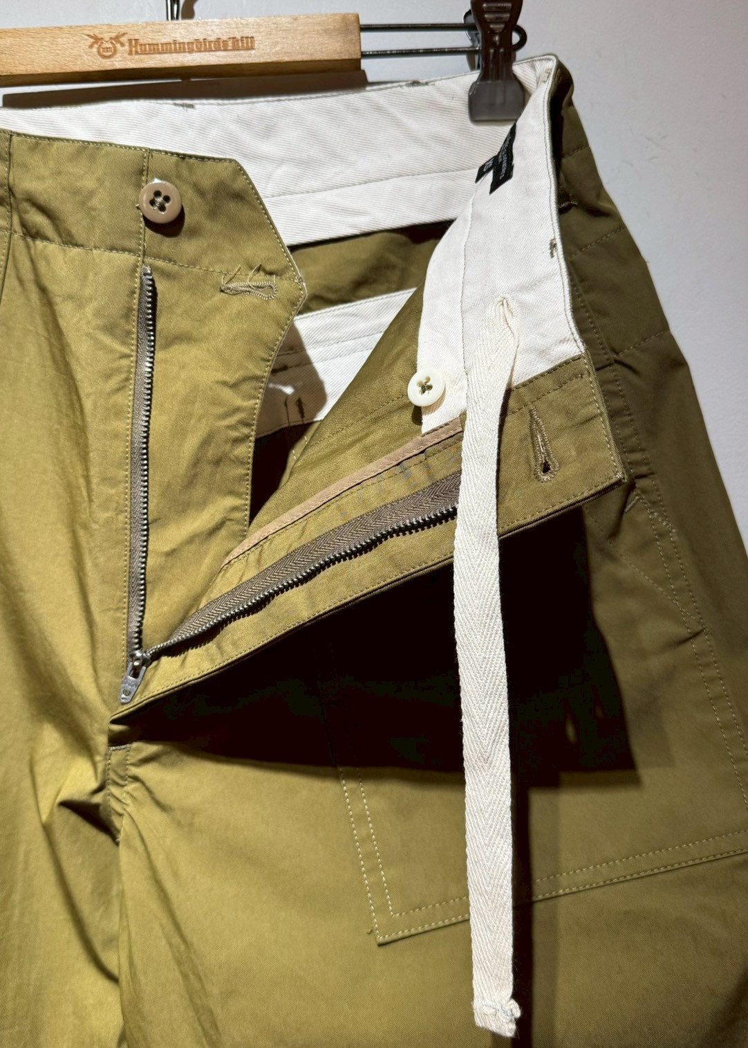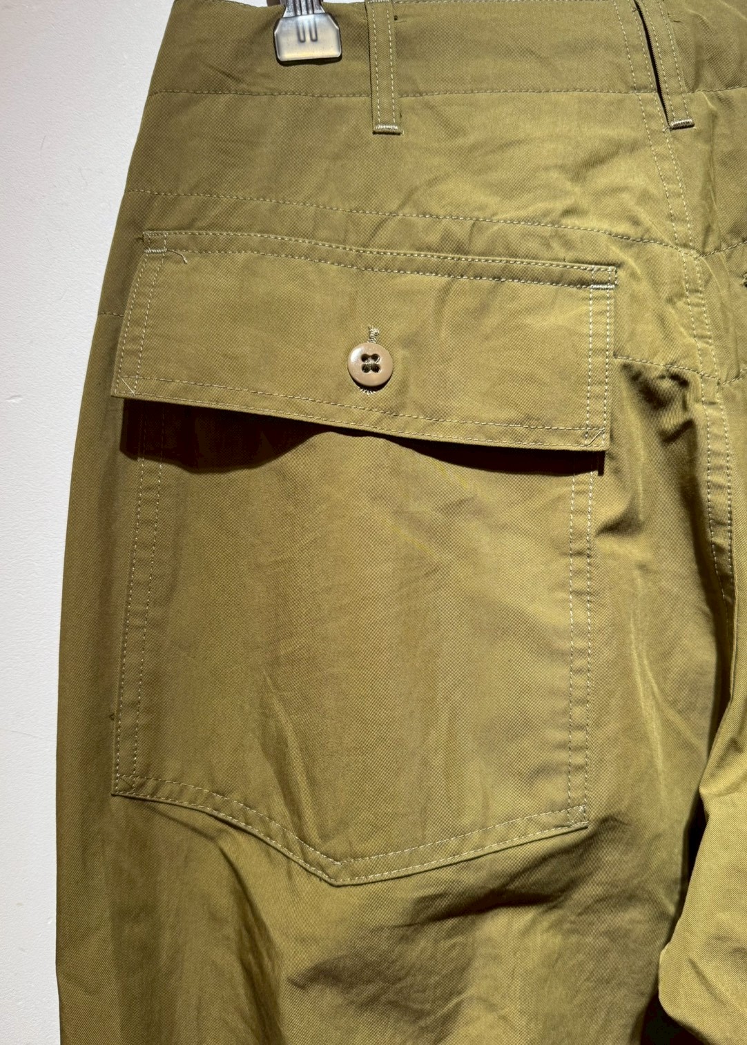 USアーミーのミリタリーパンツをベースに、独自のアレンジを加えた定番のファティーグパンツ。ナチュラルにテーパードがかかった、幅広いスタイルにマッチする万能型のシルエットが魅力です。特徴的なフロントのL字ポケット脇には、さらにジップポケットが追加されており、シンプルな中にも〈EG〉らしいユニークなギミックが備わっています。