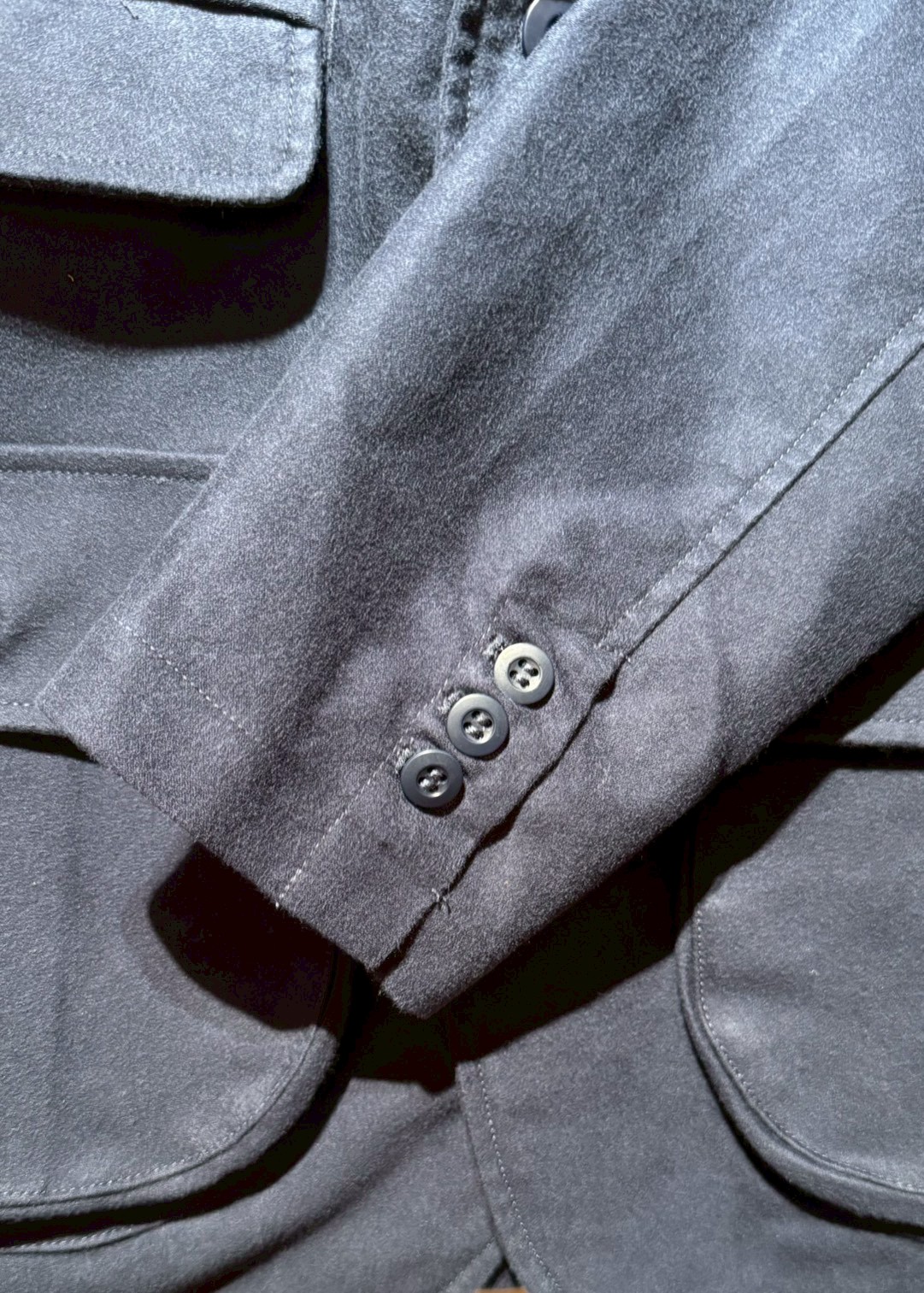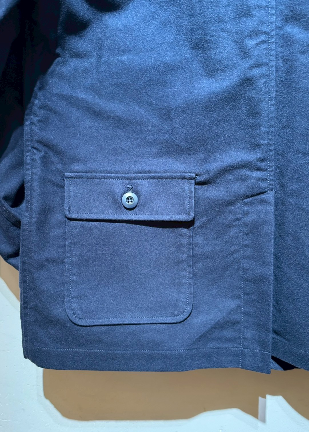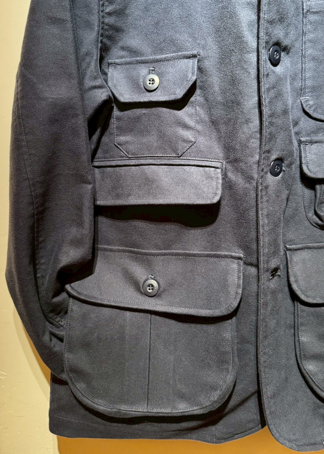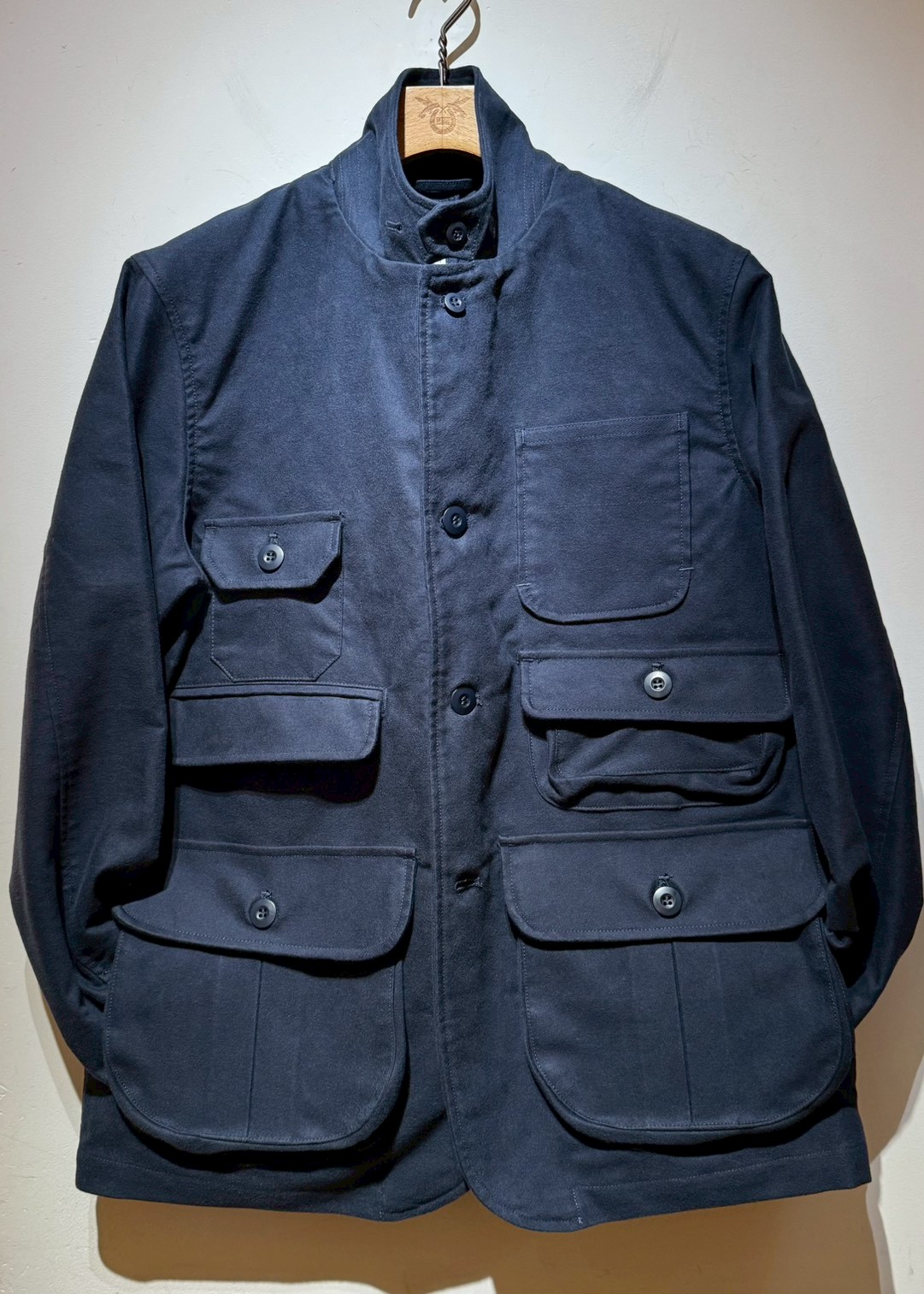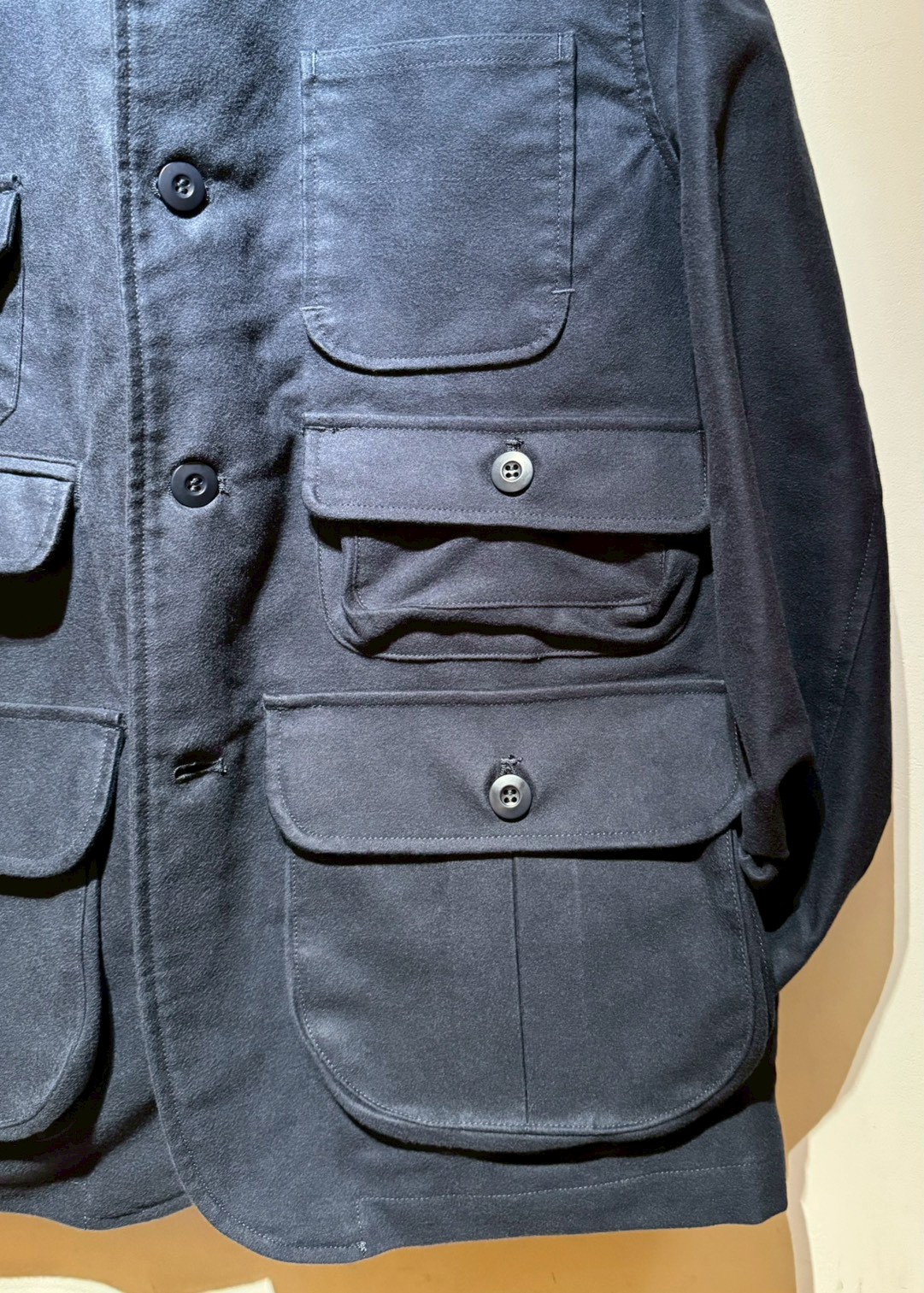 Cotton Moleskin生地を使用した、オリジナルハンティングジャケット。フロントには、大小6つのフラップ付きポケットとパッチポケットを装備。