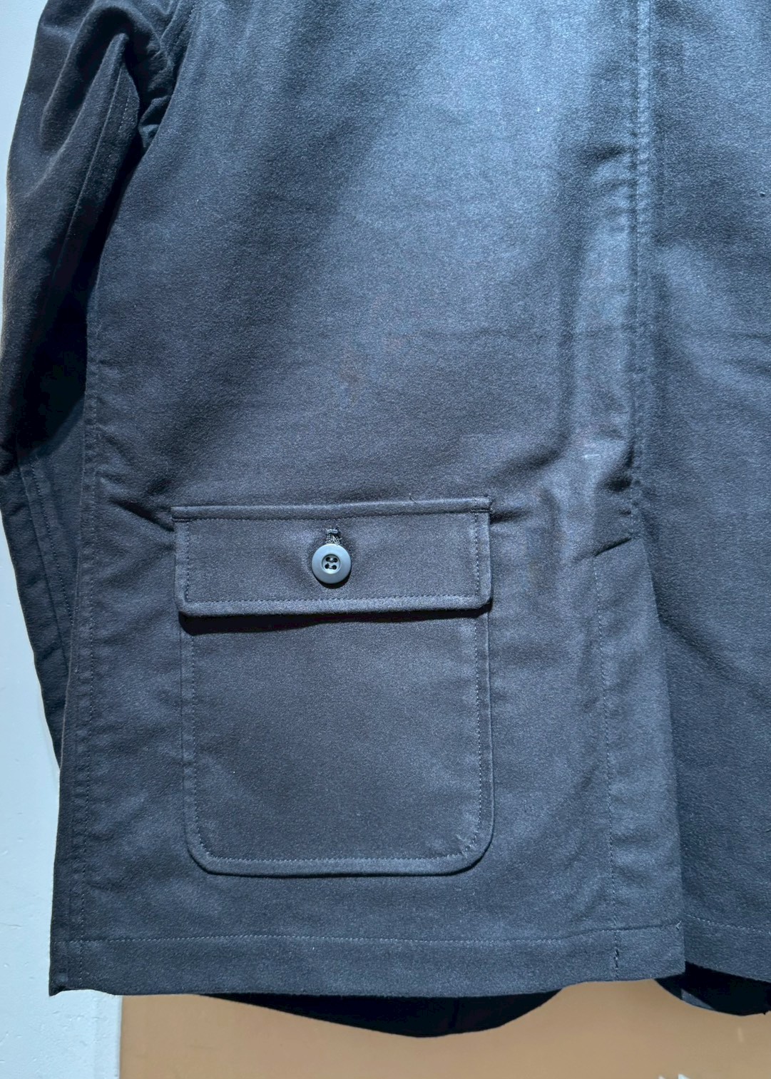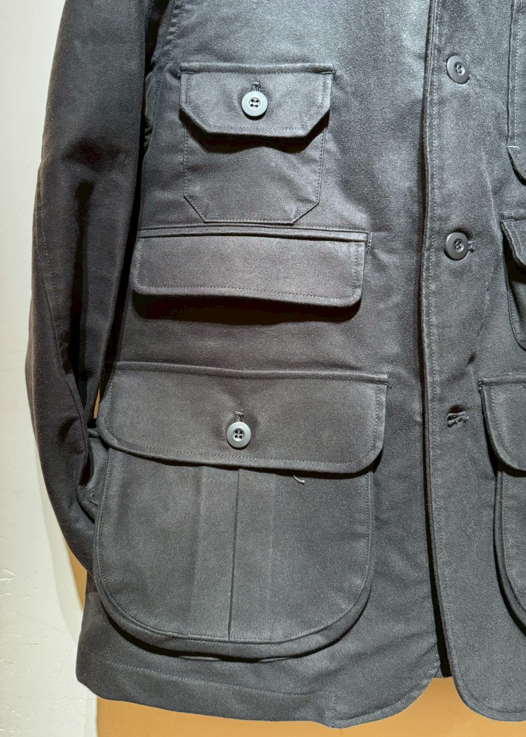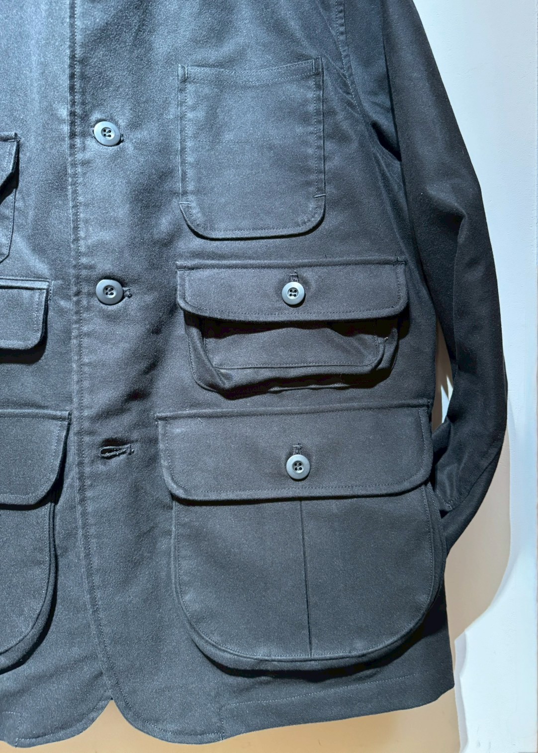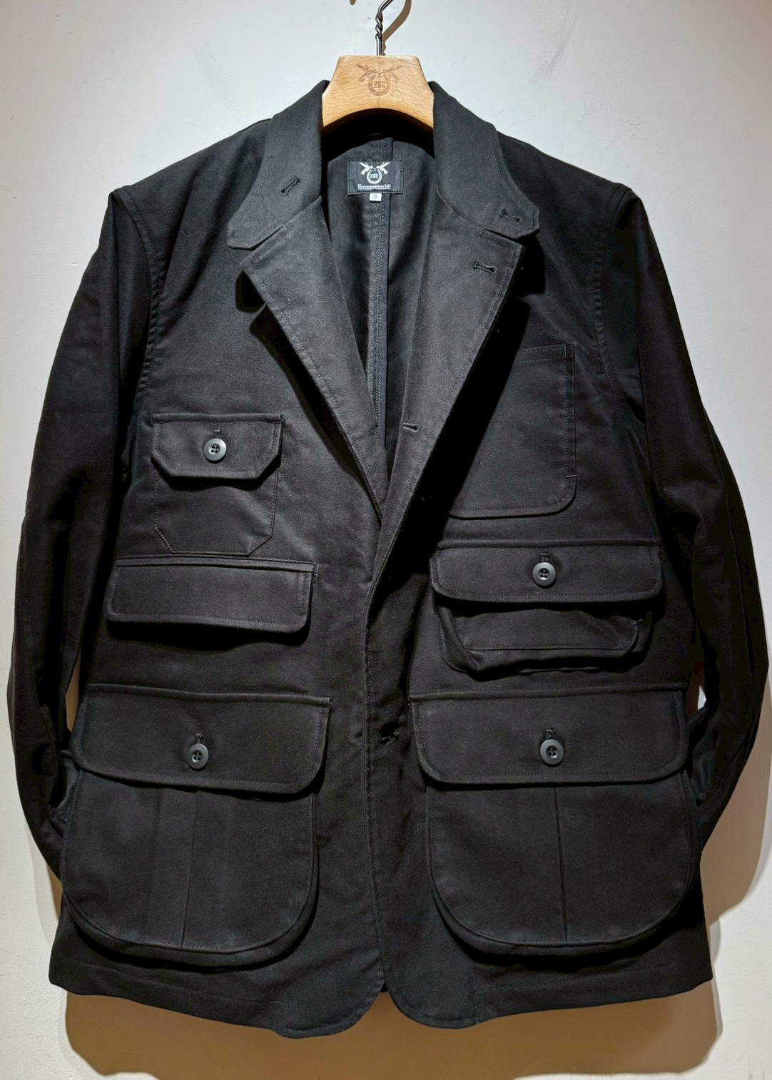 Cotton Moleskin生地を使用した、オリジナルハンティングジャケット。フロントには、大小6つのフラップ付きポケットとパッチポケットを装備。