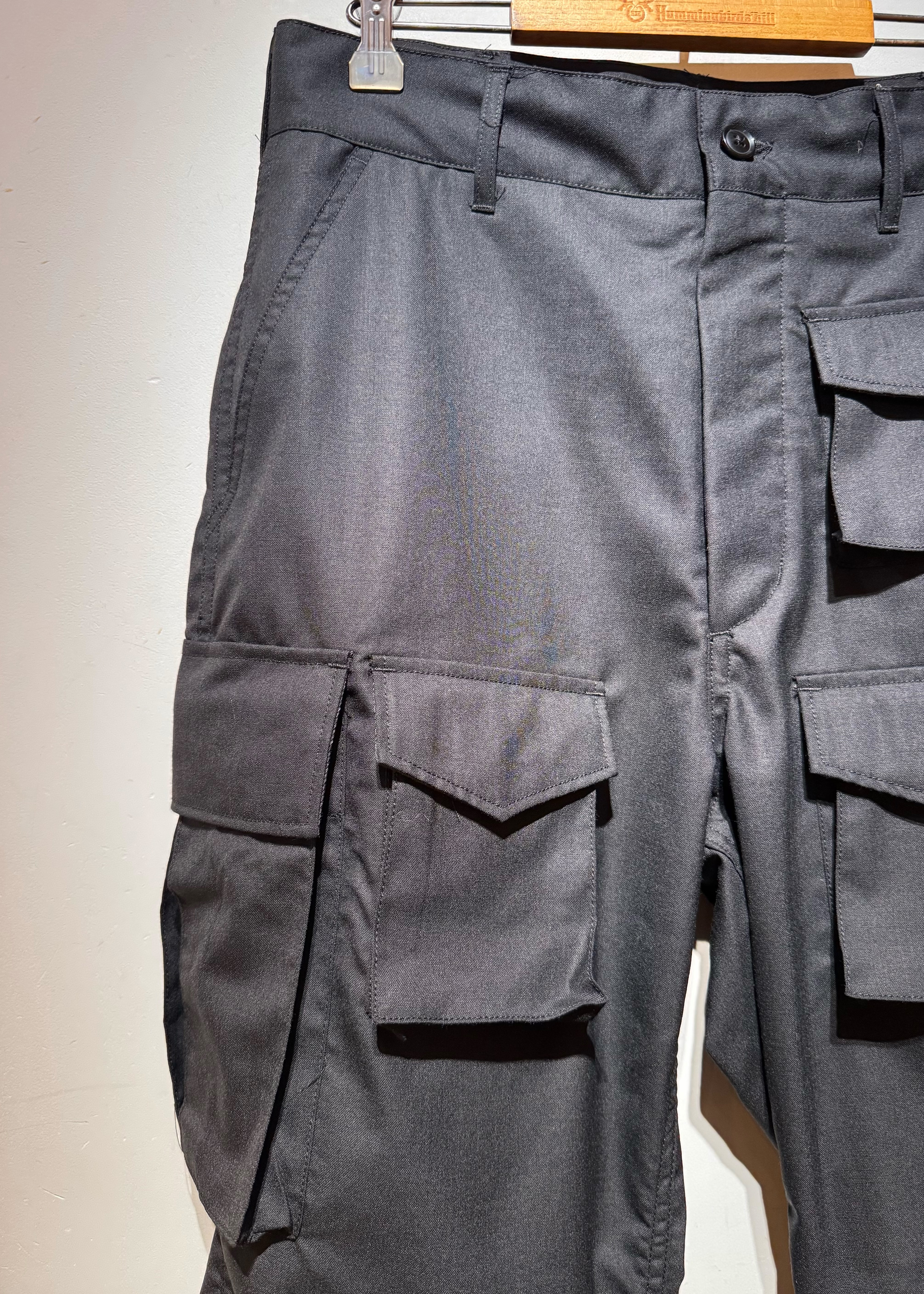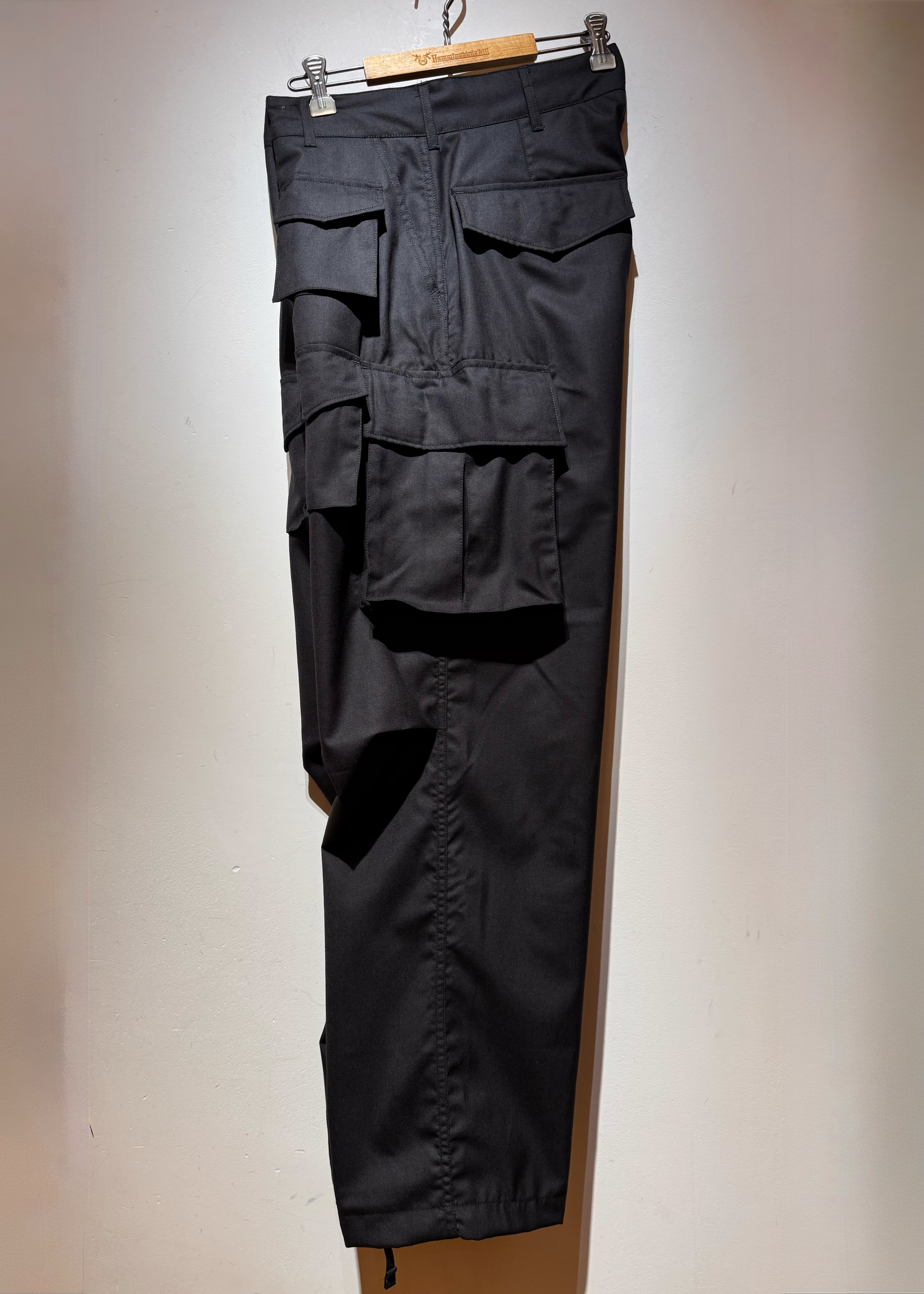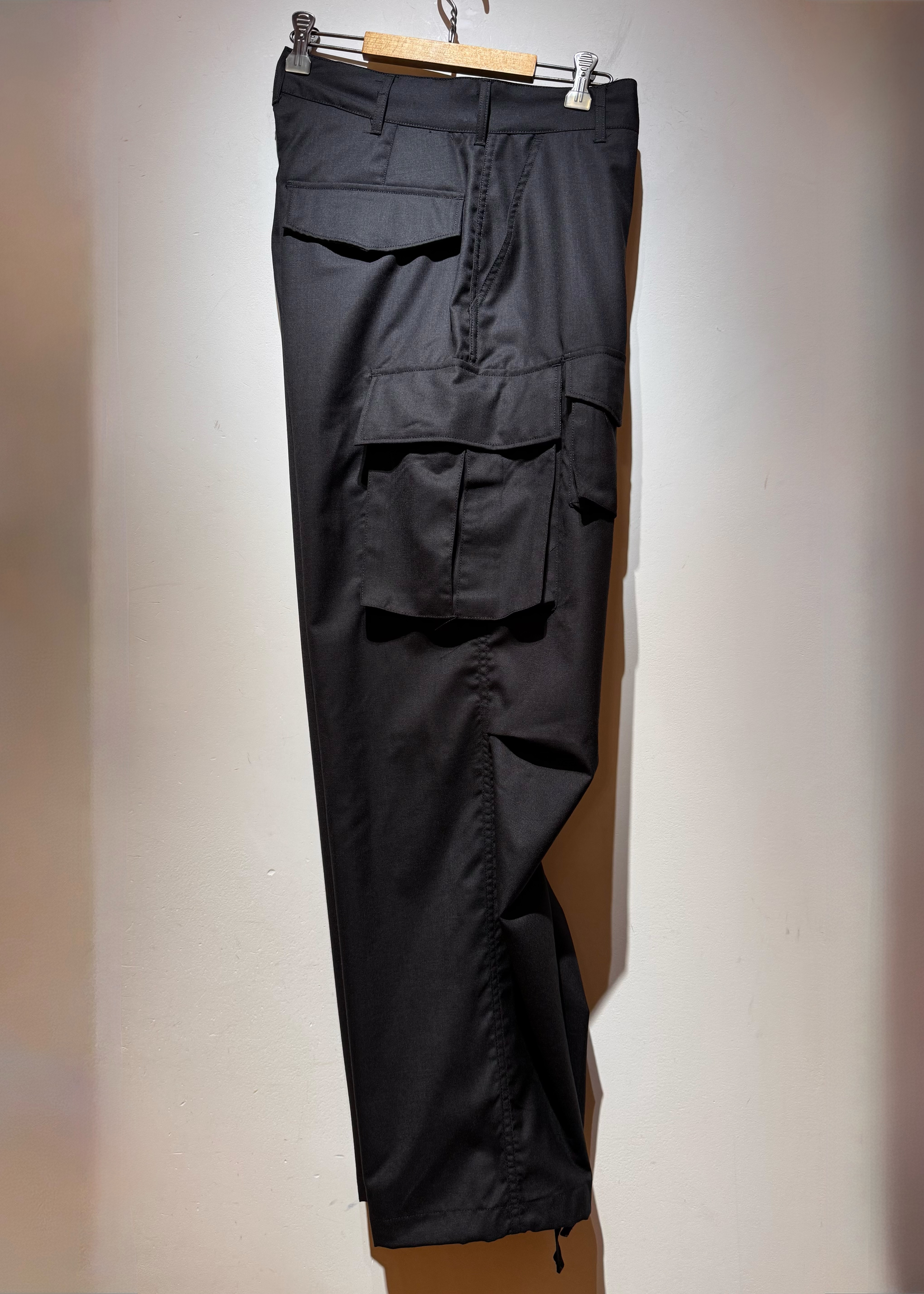 マチ付きのポケットを、両サイドとフロントに合計で5つも備えたユニークなデザインのFAパンツ。ミリタリーカーゴパンツがベースとなっており、高い収納力はもちろん、立体感のあるポケットが生み出すユニークなシルエットも魅力的なアイテムです。高級感のあるドレープと光沢が美しいトロピカルウール素材は、非常に薄手のファブリックで通気性や涼感のあるタッチも魅力です。
